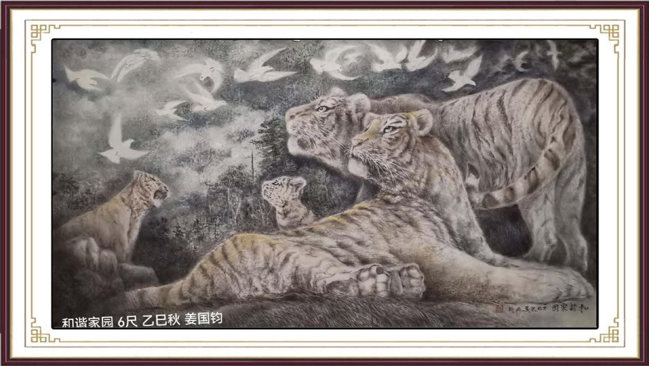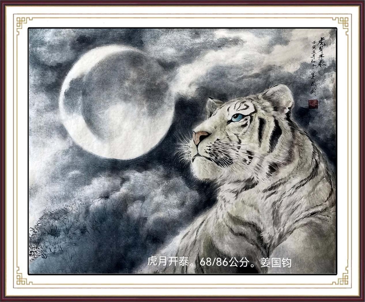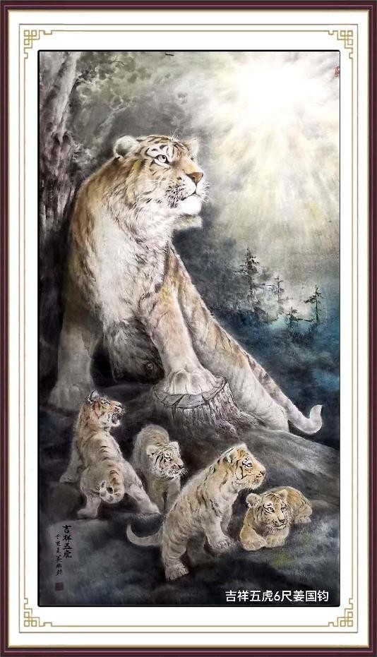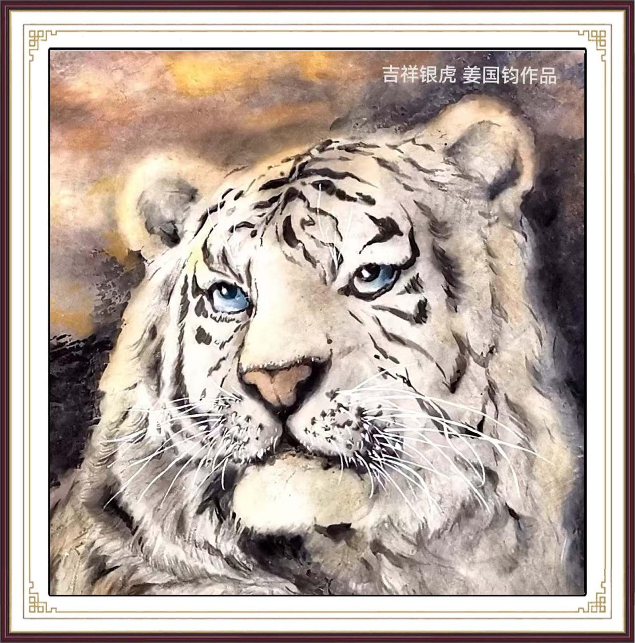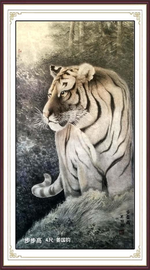 姜国钧,国宾礼国礼,特供艺术家,1947年生人,笔名:画虎者,山之子,字”虎缘”,自幼习画,自 1973 年偶遇东北虎后,他便与虎结下了不解之缘,专注于画虎艺术已逾半个世纪。他不仅擅长国画工笔与水墨, 同时对水彩与油画亦有深厚造诣。