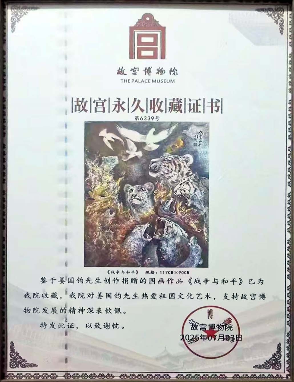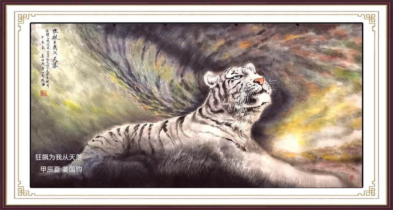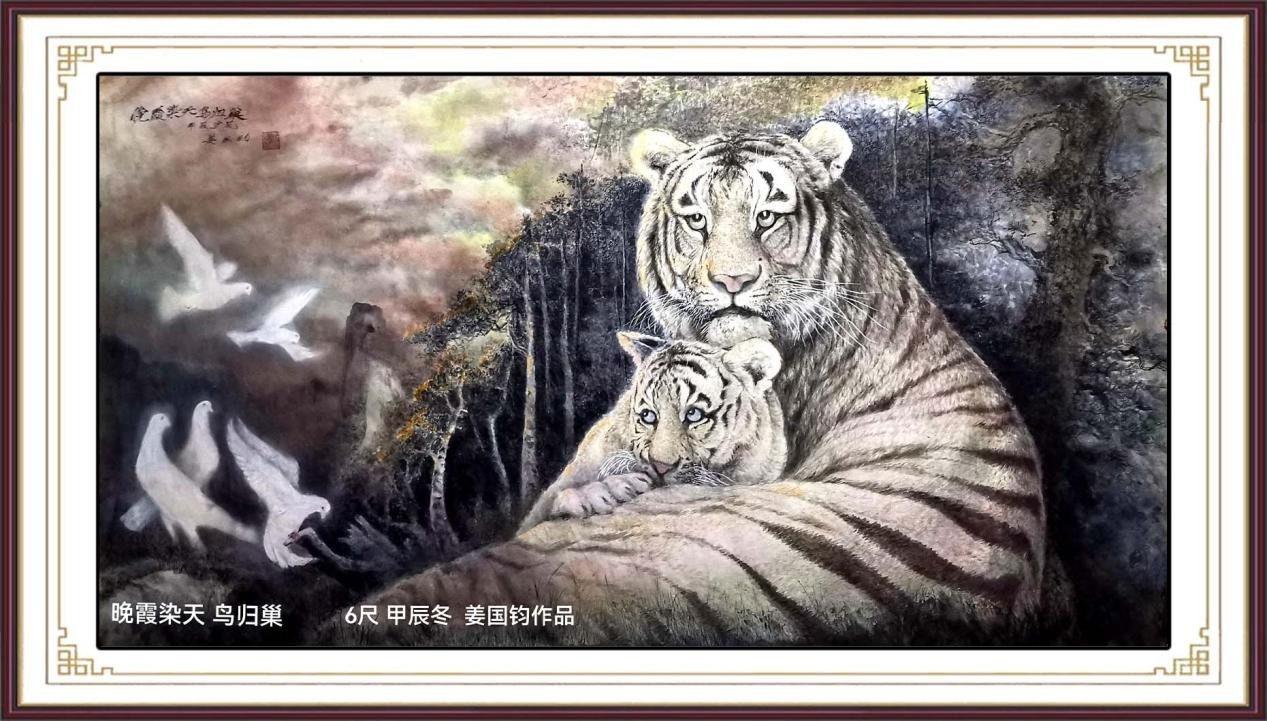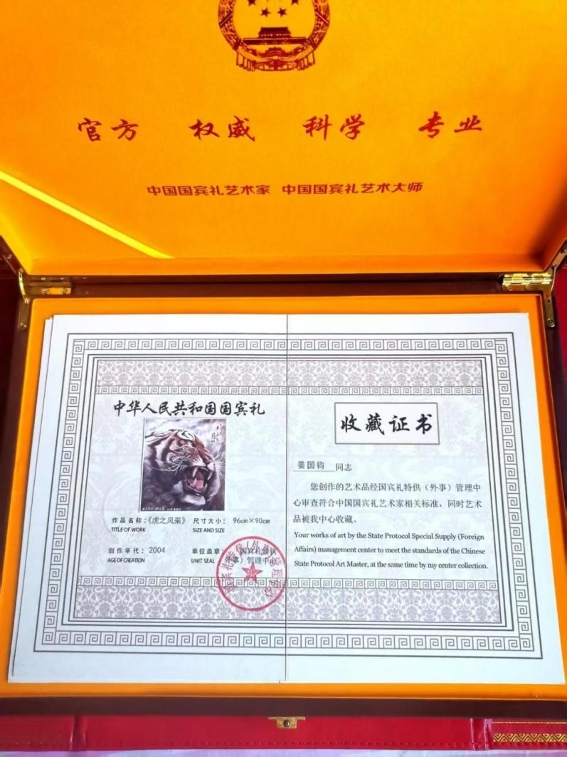 姜国钧,国宾礼国礼,特供艺术家,1947年生人,笔名:画虎者,山之子,字”虎缘”,自幼习画,自 1973 年偶遇东北虎后,他便与虎结下了不解之缘,专注于画虎艺术已逾半个世纪。他不仅擅长国画工笔与水墨, 同时对水彩与油画亦有深厚造诣。