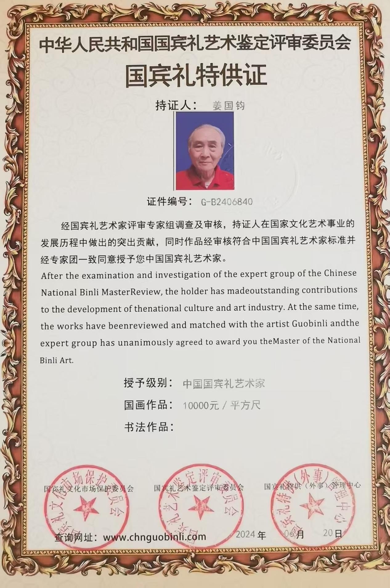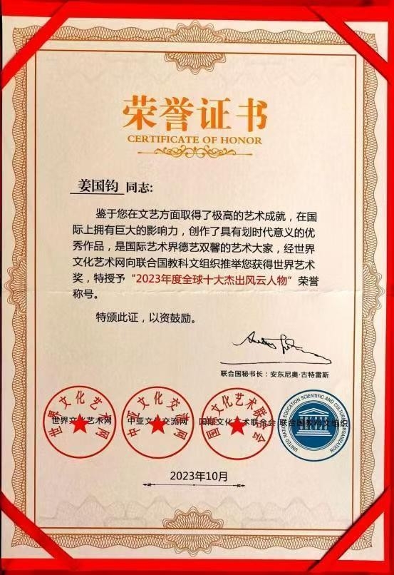 姜国钧的艺术生涯不仅限于创作,他的成就也被广泛认可。他荣获了多项荣誉称号,包括中国文化艺术人才管理中心联合授予的“人民书画家”称号,中国近现代艺术家审定委员会和世界艺术品市场发展中心授予的“中华人民共和国美术大家”称号,以及经联合国秘书长安东尼奥·古特雷斯签字授予的“2023 年度全球十大杰出风云人物”荣誉称号等。
