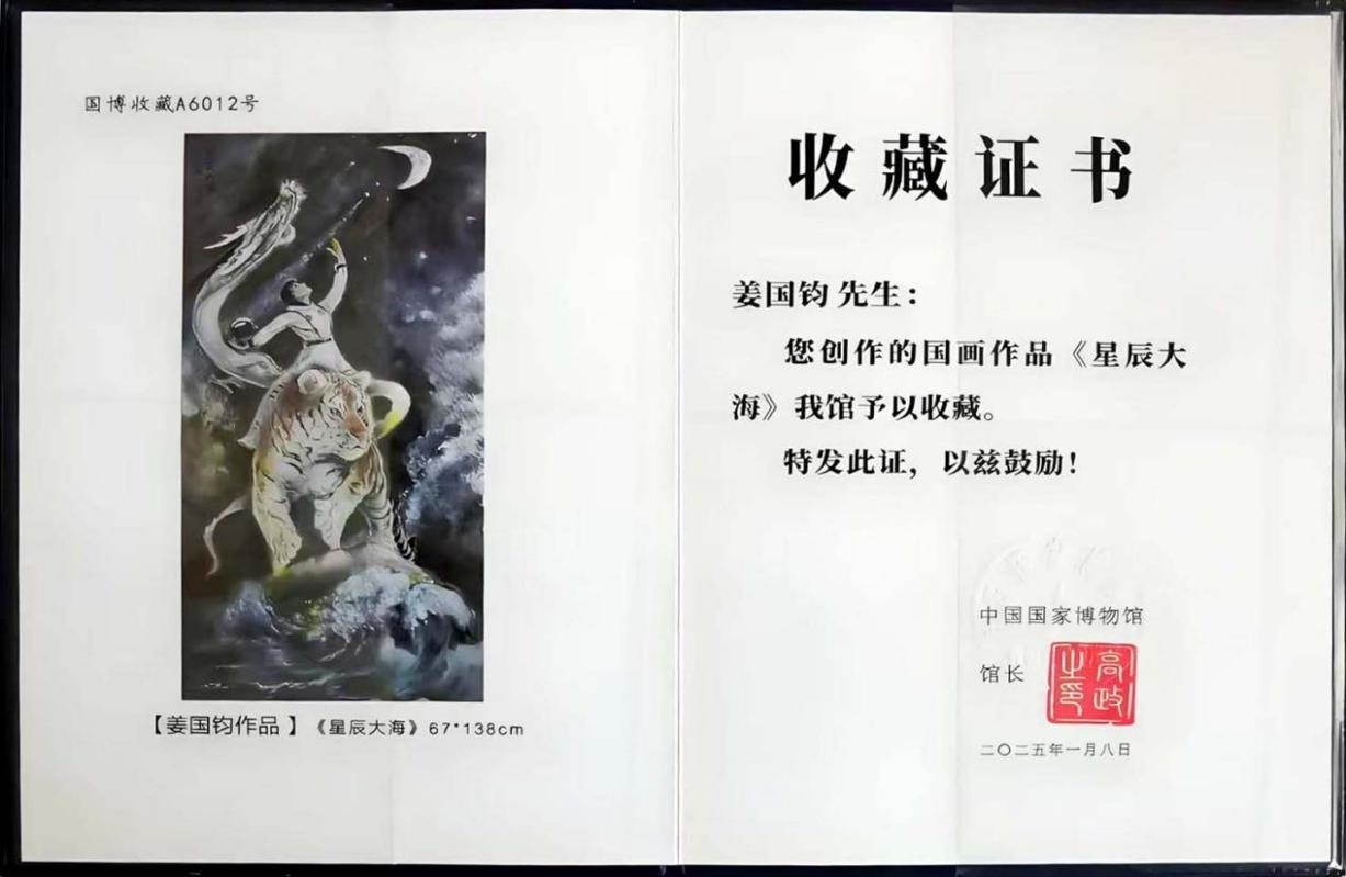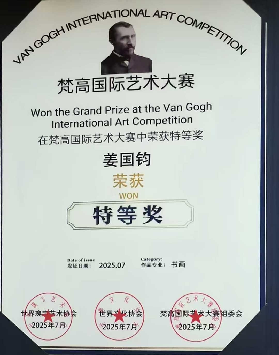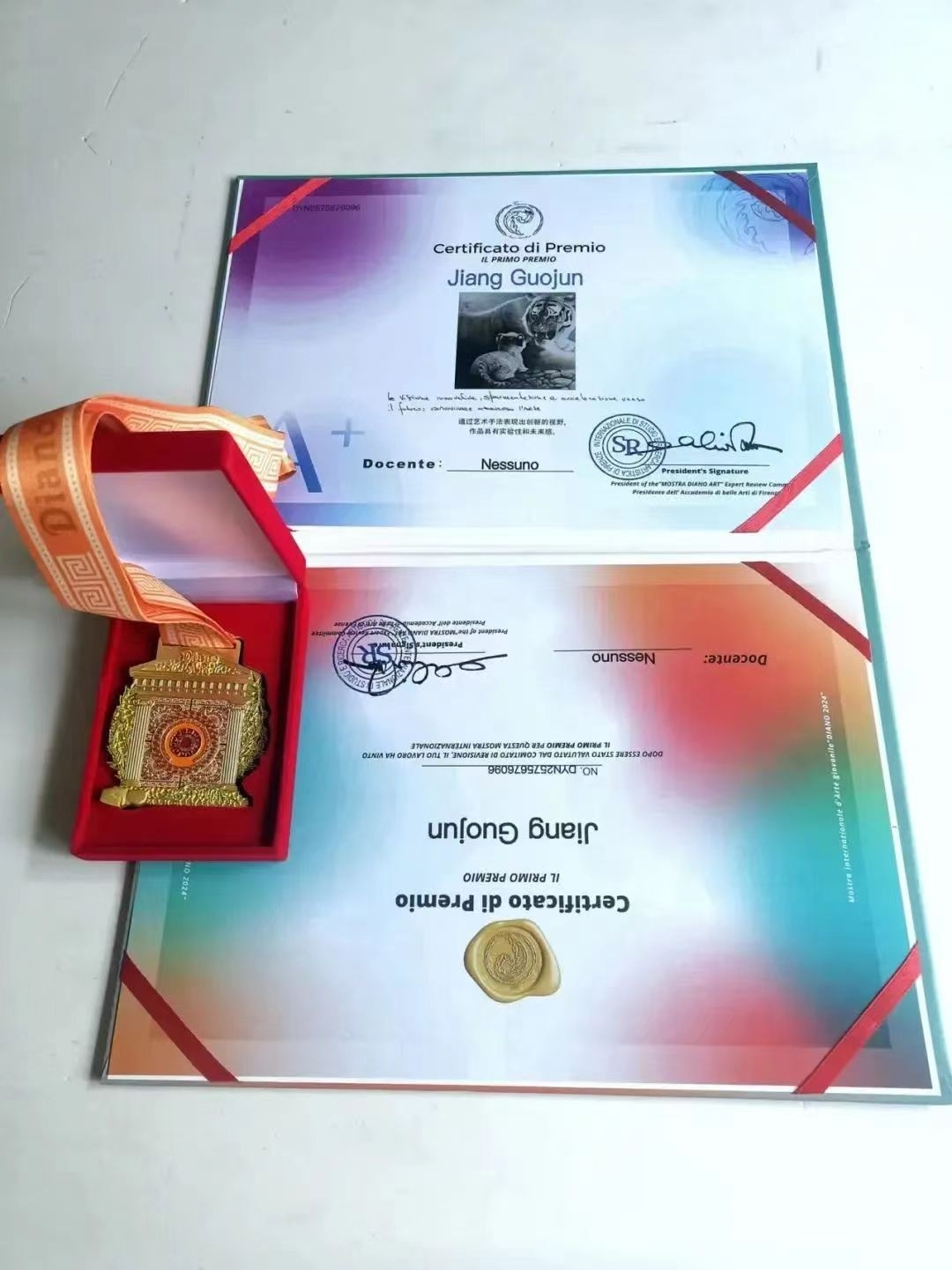 此外,姜国钧在 2024 年更是迎来了艺术生涯的高光时刻。他的作品参展了《三地风华——港澳台书画大展》,并在“蒂亚诺”——世界四大美院国际艺术交流展中荣获国际一等奖(金奖),同时获得了欧盟国际艺术中心颁发的《作品测评证书》。他的作品还被录入大金砖十国文化艺术榜单,进一步扩大了国际影响力。