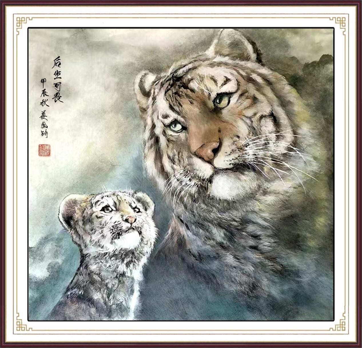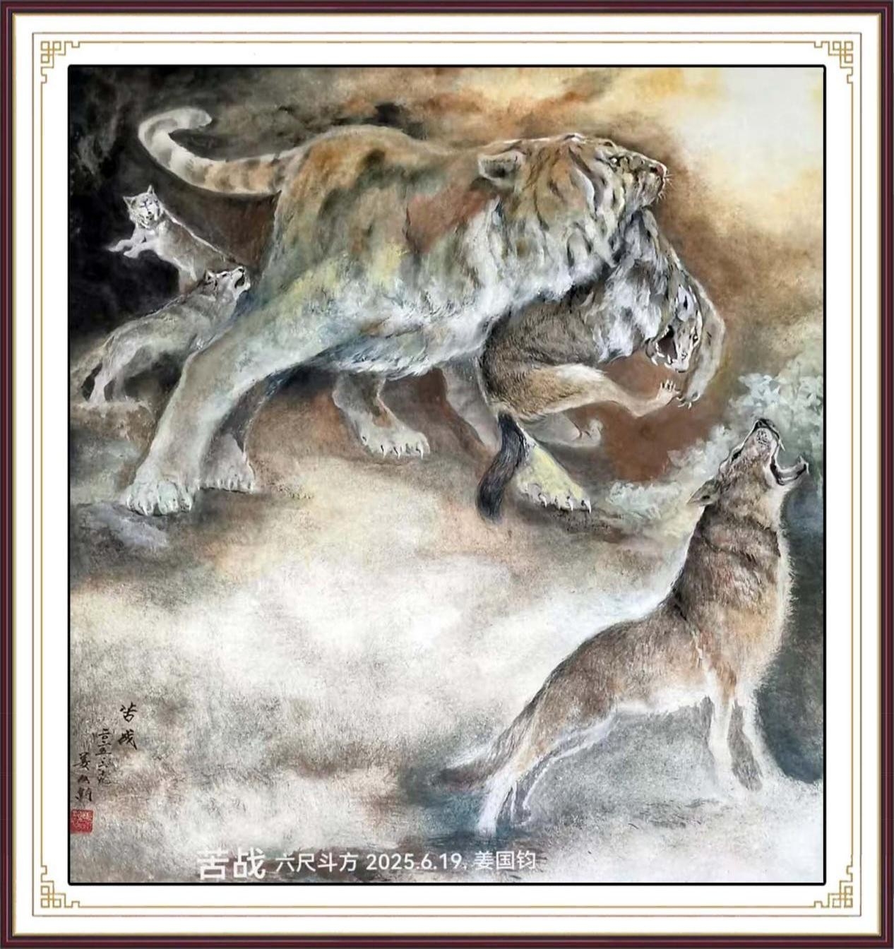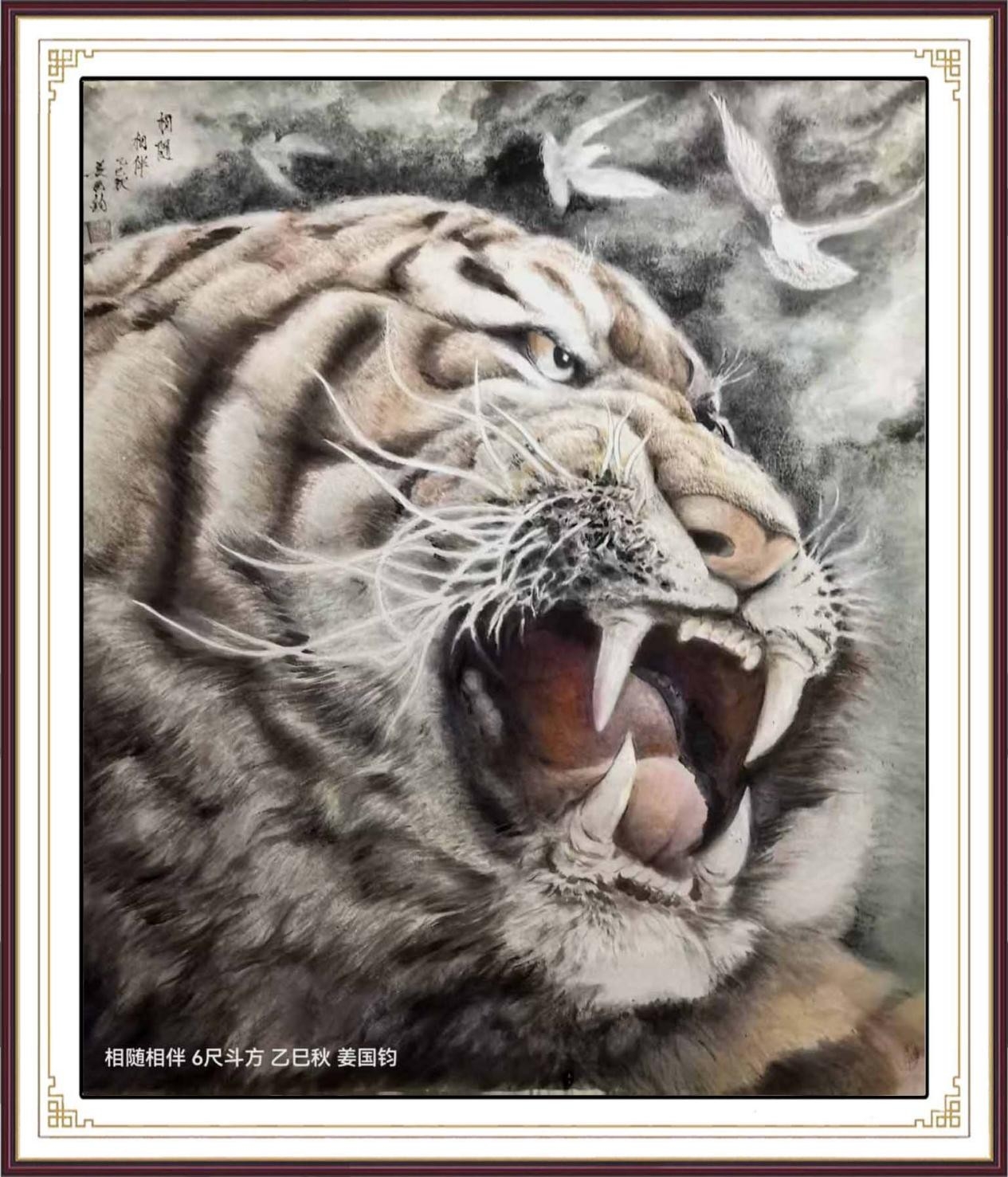 姜先生本人便是一位德艺双馨的艺术楷模。您对绘画艺术满怀赤诚,几十年来潜心钻研,将全部心血都倾注于画笔之下,这份执着与热爱令人动容。其谦逊温和的品格在艺术圈中广为传颂,面对赞誉,他总是淡然处之,更专注于艺术创作的不断精进。深入山林,细致观察虎的生活习性与形态特征,这种严谨的治学态度和对艺术负责的精神,使得他笔下的虎如此逼真传神。同时,他还热衷于分享自己的绘画经验,对后学晚辈不吝赐教,以自身的言行传承着艺术的火种,照亮他人的艺术之路,是一位备受尊敬的艺术家,其品德与才华皆熠熠生辉, 值得我们致以深深的敬意与钦佩。