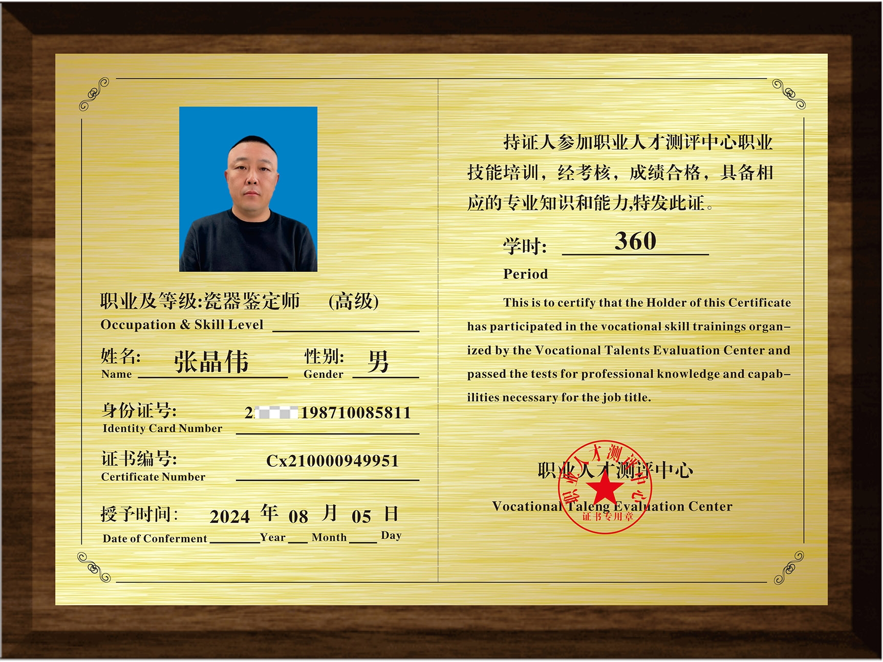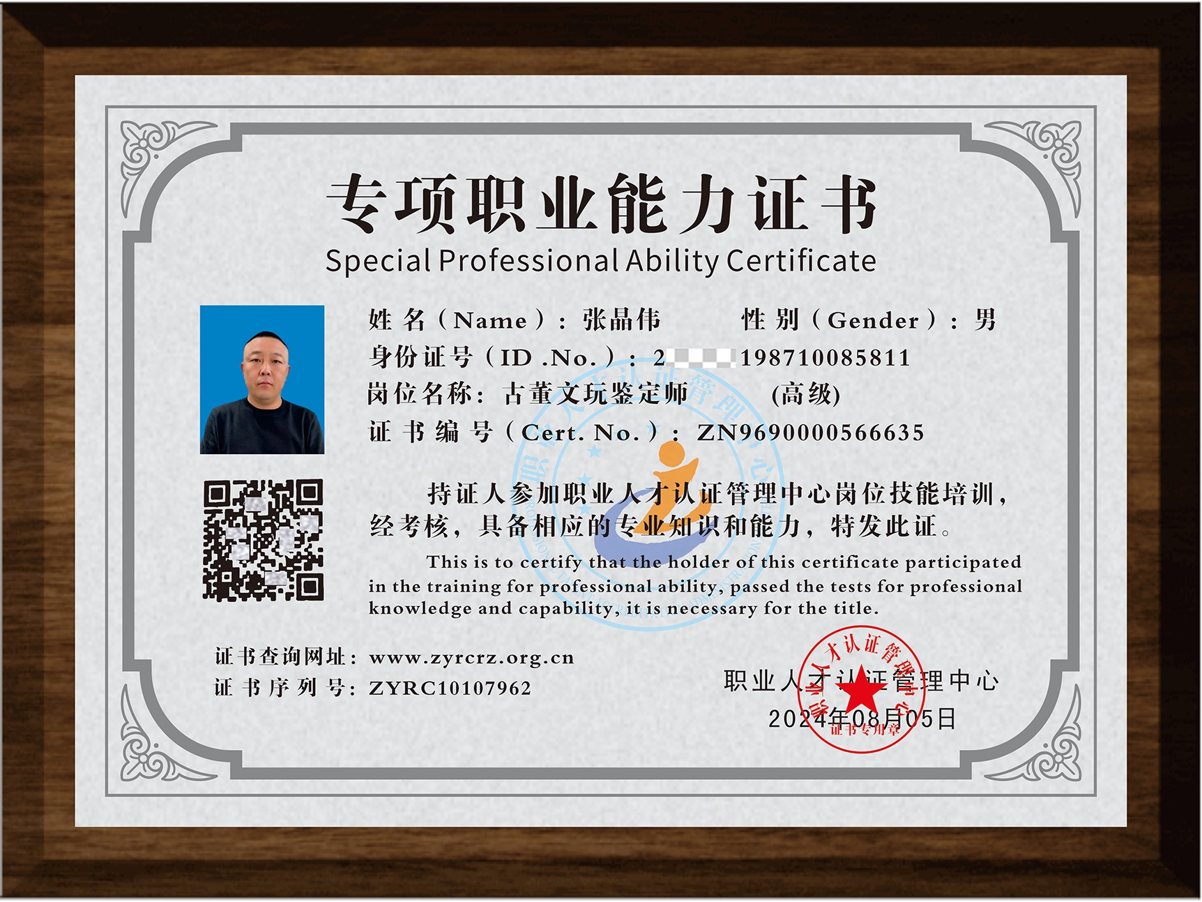 2024年8月,中国管理科学研究院深造,中国人才技能认证管理办公室授予颁发:古董文物(高级)鉴定师。