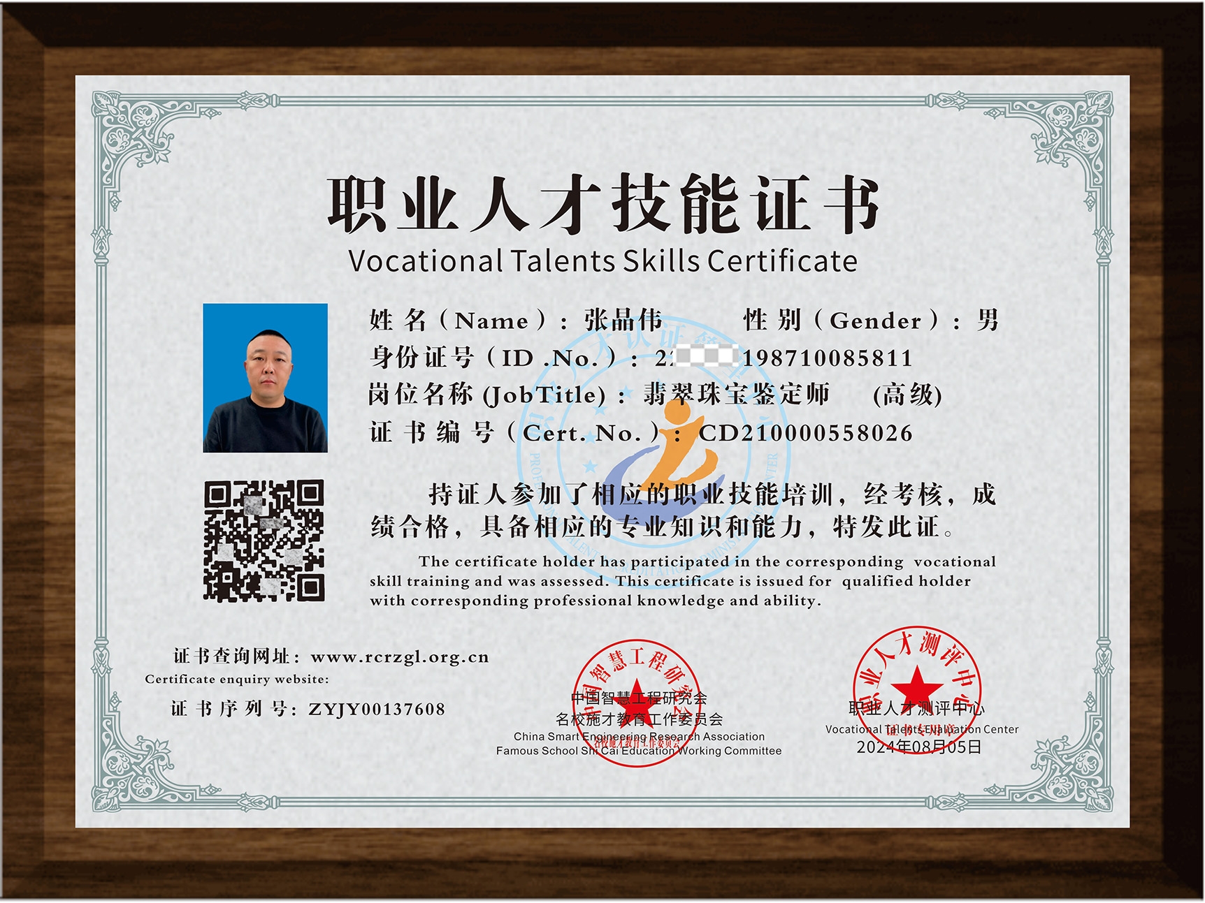 2024年8月,中国管理科学研究院深造,中国人才技能认证管理办公室授予颁发:翡翠珠宝(高级)鉴定师。