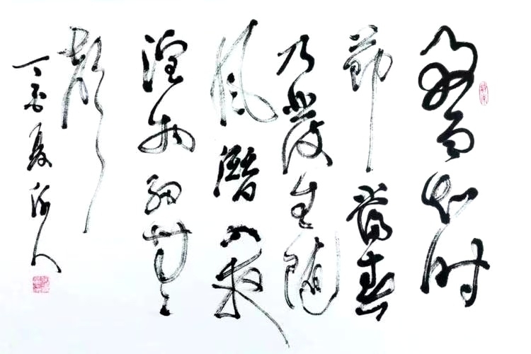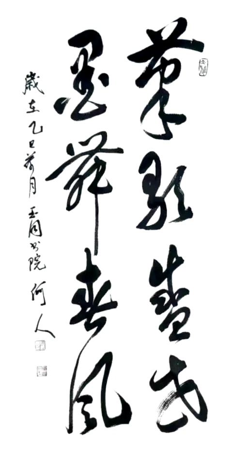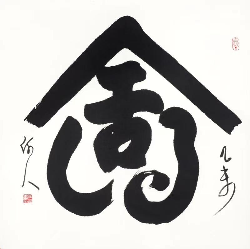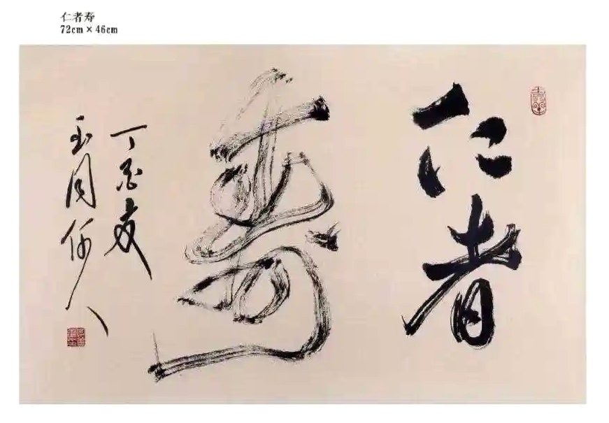 何善章的书法以“线条艺术”为核心,注重诗、书、画、印与音乐、哲理的融合,追求视觉表现与意境营造的统一。他善于根据文字内容进行构思创作,使作品兼具形式美感与精神内涵,如《马》字表现鬃飞蹄扬的奔腾之势,《龙》字则呈现蛟龙腾云的动态意象。