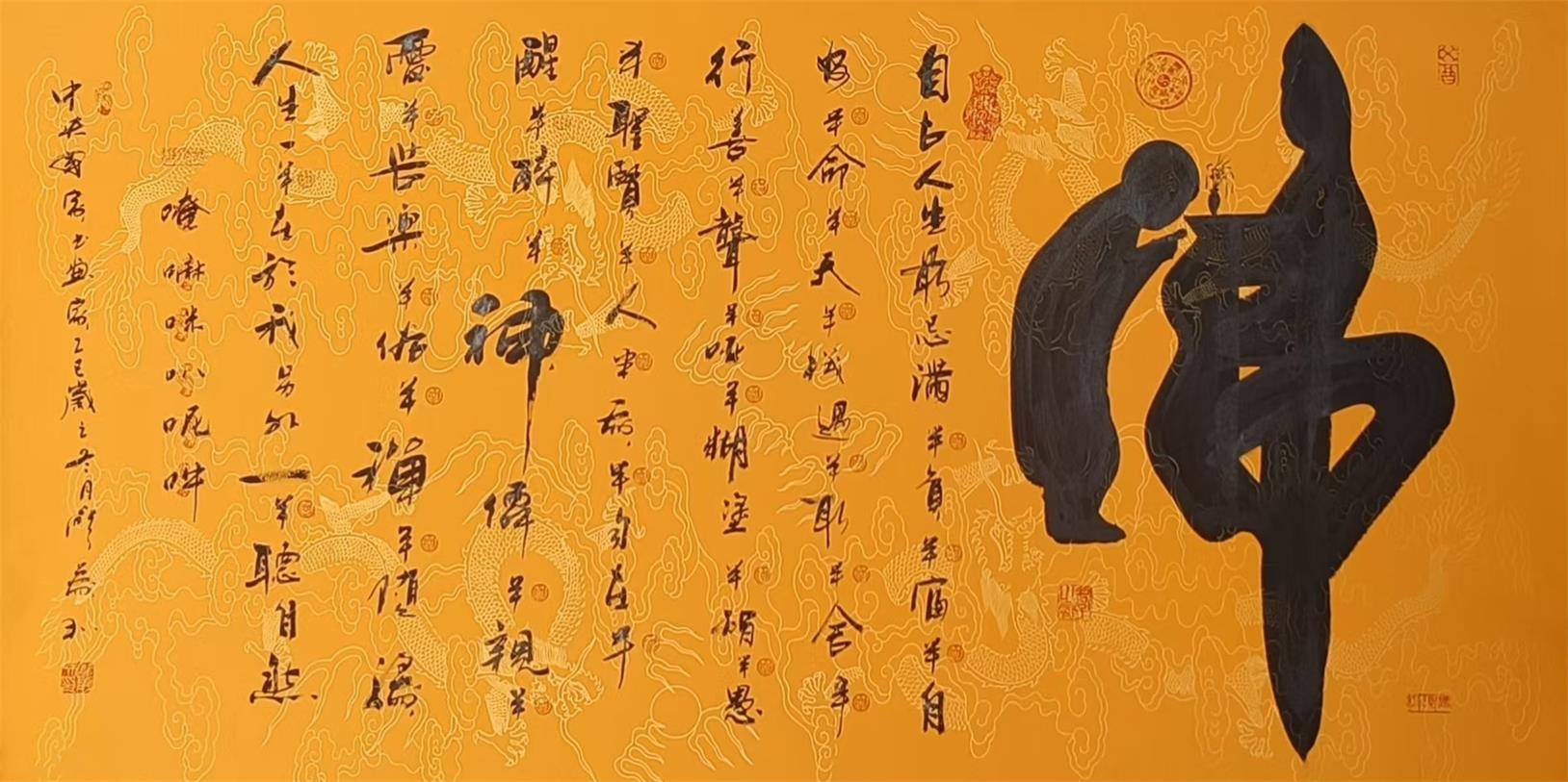 廖义和老师综合各家所长,打破传统很多观念,创造了独具一格的书法审美视觉,形成了天浮、地坐、等式、多边、圆形、长方、正方等字体书法形体体系,行体贯通,让字与字之间妙笔生辉,意蕴无.所以廖老师的字,既无先代大家的形貌,也无先代大家的不羁,更多的是追求中国字形体的美以及对生活的思考。廖义和老师的字,体现了他一生的成长:年轻时的憧憬,青年时的挫折,中年时的奔波,都在字间流露无遗,就象汉字在演练五千年中国文化一样。