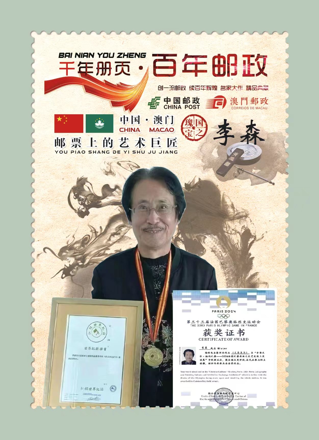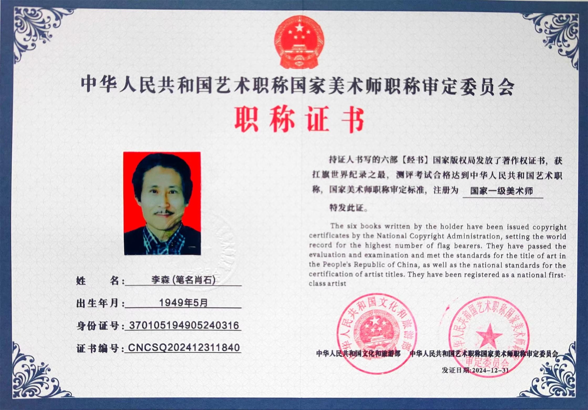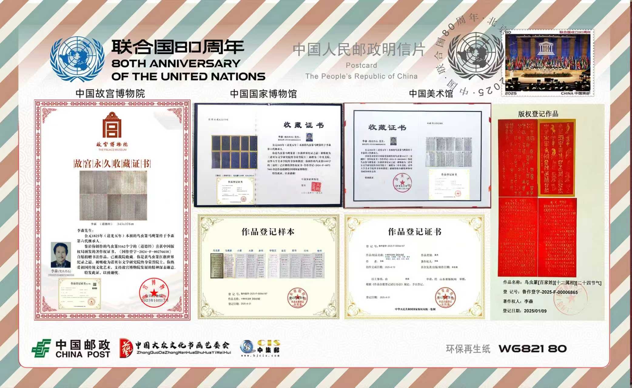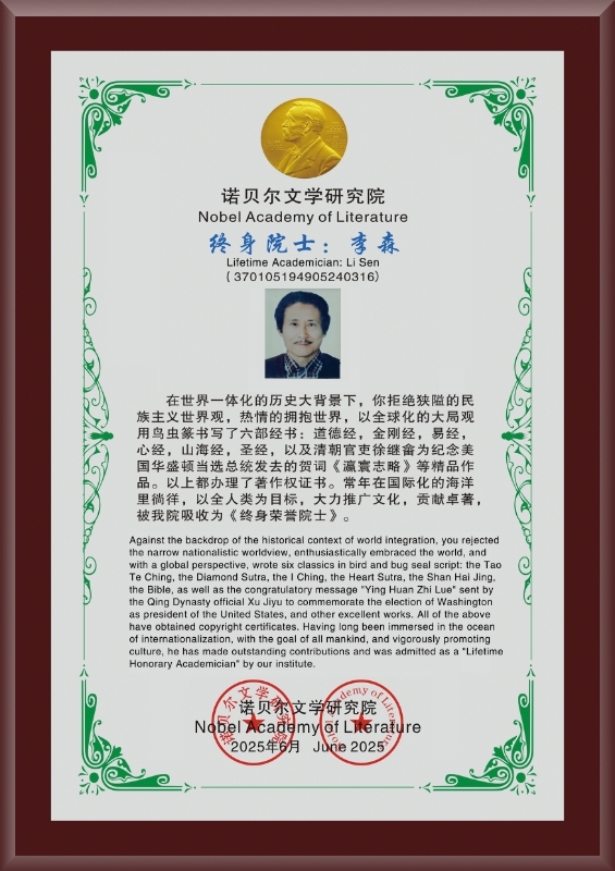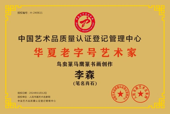 到了第七十二世孙李森手中,这份传承已经走过整整二百年的光阴。作为李氏鸟虫篆、马鹰篆的第六代承传人,李森自幼浸润在墨香之中,凭借71年如一日的刻苦习练钻研,练就了扎实深厚的书法功底。他不仅将两门篆艺的精髓融会贯通,更打破了家族传承的局限,广收门徒百名,让这门曾深藏于皇家殿堂的艺术走出殿阁,走向更广阔的天地。李森也因此被誉为《扛旗世界纪录之最》篆艺扛旗第一人,民族的就是世界的,荣膺《诺贝尔文学研究院终身荣誉院士》特聘为《中央美院和清华大学美术学院终身客座敎授》,中华人民共和国文化和旅游部经严格测评为国家一级美术师。经过数年篆写的鸟虫篆书法作品,5162字的《道德经》,被故宫博物院收藏;5162字的《金刚经》,被中国美术馆收藏:5169字的《易经》,被中国国家博物馆收藏,都喜获了中国版权局发放的著作权证书。留给华夏的是一部91251个汉字鸟虫篆马鹰篆书法查阅字典传创峻工的工具书,与世界共存,留芳百世。